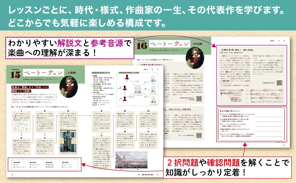 各レッスンには、内容の理解を助ける問題や、作品を実際に聴ける参考音源への二次元コードを掲載しています。音源を聴くことで、解説をより深く理解できます。