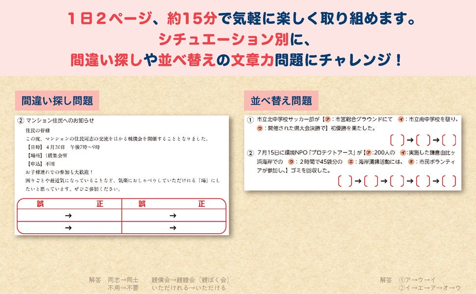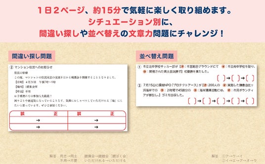 社会生活を円滑に営むための文章のコツを、親しい間でのやりとりやビジネスシーンなどのシチュエーションの中で、楽しく解きながら身につけることができます。