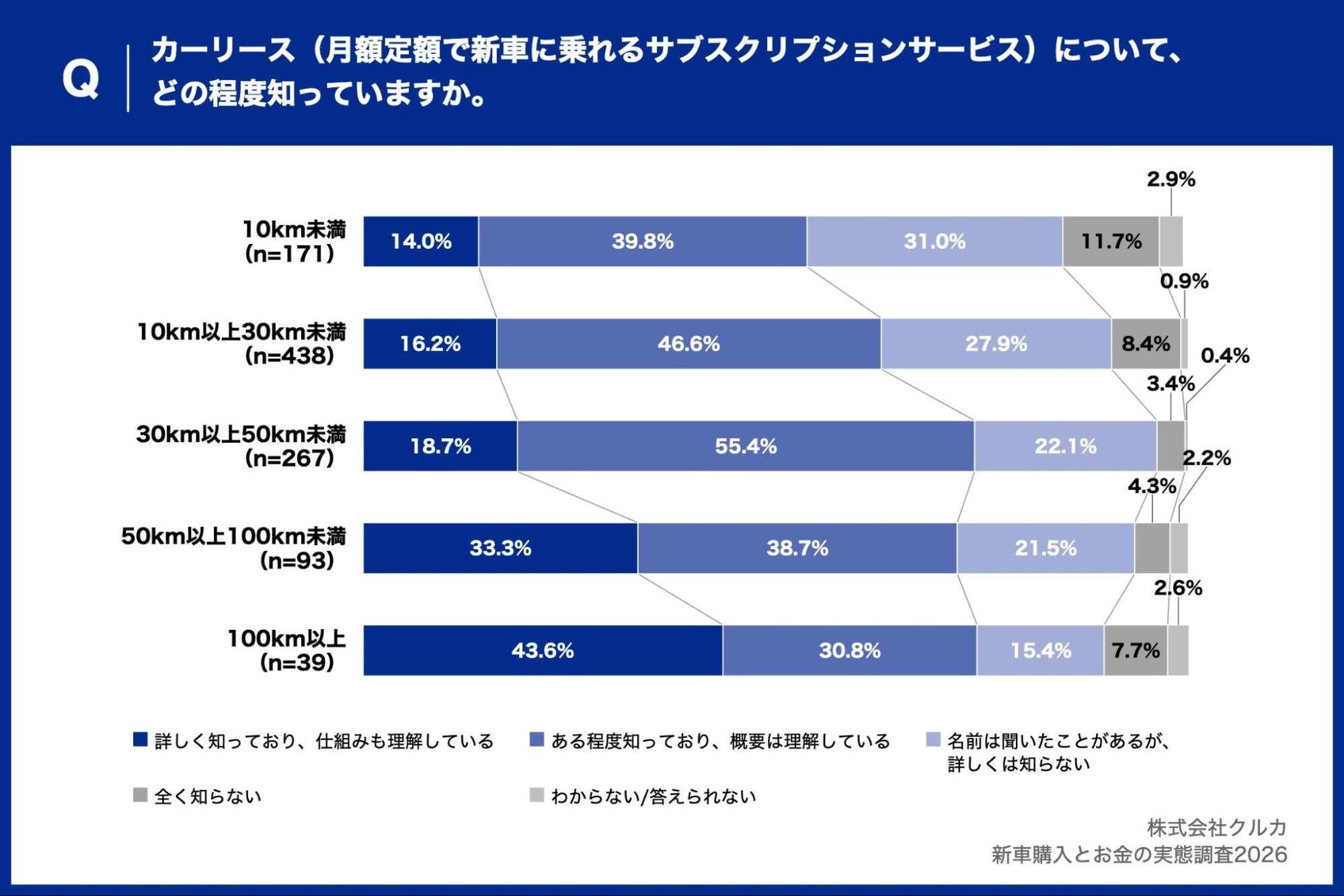 - 01|1回あたりの平均走行距離が100km以上の層、43.6%カーリース理解度について「詳しく知っている」 一方、10km未満は14.0%にとどまる