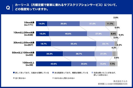 まず、カーリース(月額定額で新車に乗れるサブスクリプションサービス)について、どの程度知っているかという質問では、1回あたりの平均走行距離が長くなるほど「詳しく知っており、仕組みも理解している」の割合が高くなる傾向が顕著に表れました。