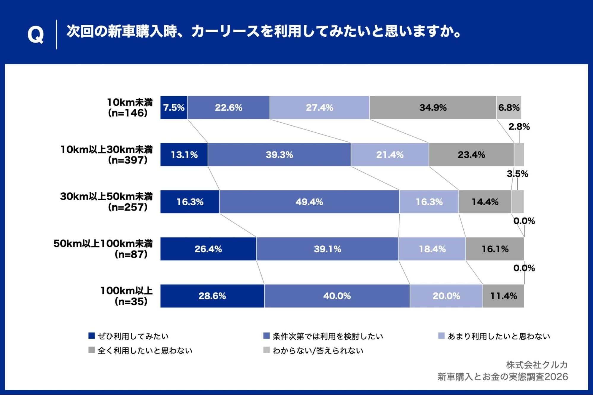 また、10km未満の層では「全く利用したいと思わない」が34.9%と最多を占めており、走行距離の短い層ではカーリースが選択肢に入りにくい傾向が鮮明です。