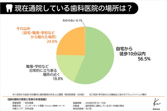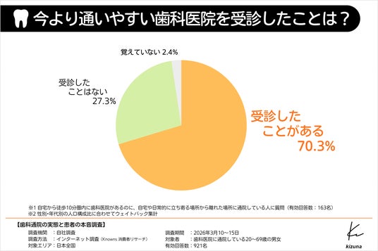 そこで、患者さまとの対話を重視し、予防歯科から審美治療まで幅広い歯科医療を提供する『医療法人きずな きずな歯科クリニック』( https://www.kizna-dc.com/ )(所在地:兵庫県神戸市北区、院長:水野貴文)は、歯科通院の実態や転院を決める背景を明らかにするため、全国の20~69歳の男女921名を対象に調査を実施しました。