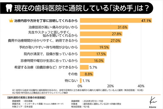 最も多かったのは、「治療内容や方針を丁寧に説明してくれるから」の47.1%でした。これに「治療技術が高い・痛みが少ないから」が31.6%、「先生やスタッフと話しやすく、悩みを聞いてくれるから」が27.8%、「費用や治療期間が分かりやすく、納得できるから」が27.0%で続いています。