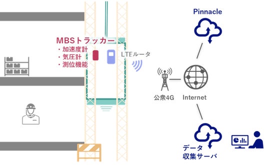 本実証では、加速度センサーを用いてエレベータ稼働状況を把握しリアルタイム測位を行う独自方式のMBSトラッカーをエレベータに設置し、エレベータの位置が変化(エレベータの稼働イベントが発生)した際に測位データを取得、分析しました。なおMBSトラッカーとの通信方法は、トラッカー自体にWAN接続の機能を持たせる場合や、建設現場に用意されたWi-Fi環境を使う方法などもありますが、今回は短期検証での扱いやすさを重視しLTEモバイルルータを活用した構成としています。