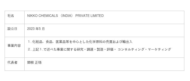 日光ケミカルズ株式会社(本社:東京都中央区、代表取締役 社長執行役員 中原秀之)は、インドにおいて現地法人「NIKKO CHEMICALS(INDIA)PRIVATE LIMITED」を2023年5月に設立いたしましたので、お知らせいたします。