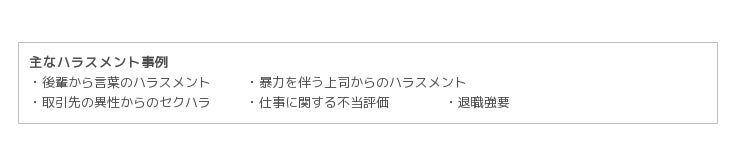 また、この度の電話相談において注目していたハラスメントに関する相談は78件(『職場の悩み』の28.4%)で、「人間関係」の悩みに次いで相談件数が多いという結果になりました。そのハラスメント被害の内容についても、自社内にとどまらず、取引先担当者(異性)からのセクハラや、自社の後輩からの言葉のモラハラ、そして、暴力が伴う上司からのパワハラなど、さまざまなエスカレートしたハラスメント実態が相談から浮き彫りになりました。