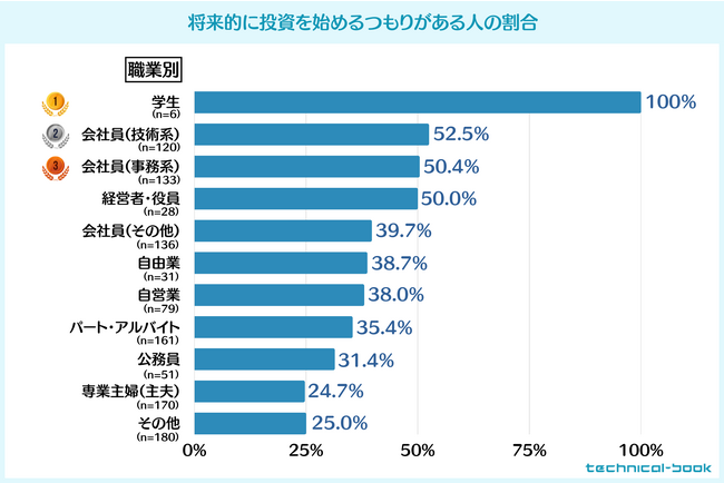 将来的に投資する意思がある人の割合を職業別に集計してみると、1位は「学生」の100%、2位は「会社員(技術系)」の52.5%、3位は「会社員(事務系)」の50.4%となりました。「学生」はサンプル数が6と少ないことも考慮する必要がありますが、非常に高い値が出ています。