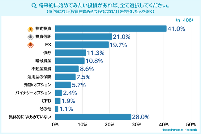 何らかの投資を選択した人のうち、最も多かった投資対象は「株式投資(トヨタ、アップルなど)」で41.0%、2位は「投資信託(日経225インデックス、S&P500インデックスなど)」で21.0%、3位は「FX(ドル円、ユーロドル取引など)」で19.7%でした。