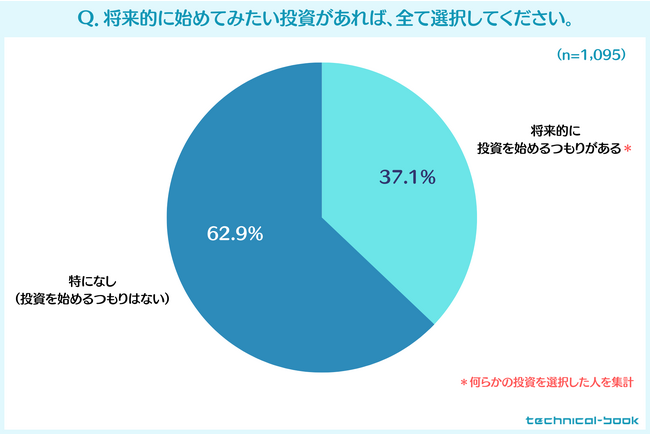 将来的に始めてみたい投資について質問したところ、「特にない(投資を始めるつもりはない)」と回答した人は62.9%で、何らかの投資を選択した人は37.1%でした。投資未経験者のうち、将来的に投資する意思があるのは3人中1人ほどのようです。