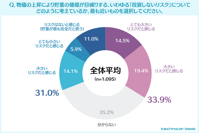 物価の上昇により貯蓄の価値が目減りする「投資しないリスク」に関する認識を質問したところ、最も多かったのは「分からない」の35.2%でした。一方、「とても大きいリスクだと感じる/大きいリスクだと感じる」は33.9%、「とても小さいリスクだと感じる/小さいリスクだと感じる/リスクはないと感じる(貯蓄が最も安全だと思う)」は31.0%となっています。