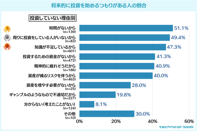 将来的に投資する意思がある人の割合を投資していない理由別に集計してみると、1位は「時間がないから」の51.1%、2位は「周りに投資している人がいないから」の49.4%、3位は「知識が不足しているから」の47.3%でした。