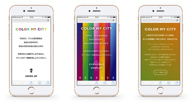 スマートフォン上で好きな色を選択しスワイプすると、テレビ塔と周辺の樹木ライトアップが、指定した色に変化します。複数人が同時に体験でき、後から選択した色にライトアップが置き換わります。