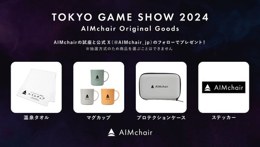 ブースにてAIMchairを体験&SNSアカウントフォローで、個数限定のオリジナルAIMchairグッズをプレゼント。どれもTGSの会場限定となるので、ゲットしにぜひブースまで遊びに来てください。