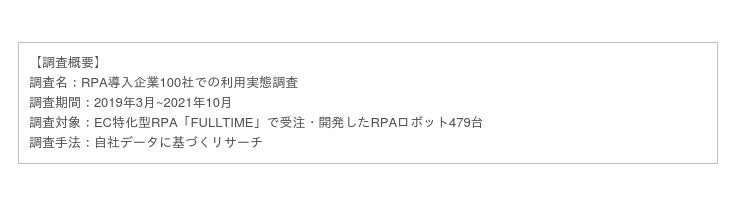 調査の結果、現在導入されている合計479台のRPAロボットの稼働時間は、1社あたり1日平均6時間であることがわかりました。導入企業に対して実施したアンケートでは、削減された時間を活用して、「販促やカスタマーサクセスなどの業務に取り組んでいる」「人員配置を見直し、新規採用コストを圧縮できた」などの声が寄せられています。