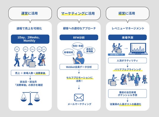 戦略データ分析基盤「スマ券Navi」の活用により、データ分析を通して来場予測の精度を上げて効果的なマーケティングを行い、施設運営の改善が可能になります。