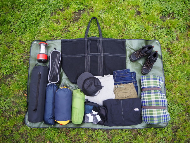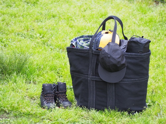 そのタフさから、アウトドアシーンでも活躍間違い無しのビッグトートバッグ。テント、マット、寝袋、チェアに加え、着替えまで収納可能。一人分のキャンプグッズが全て入る驚きの収納力。