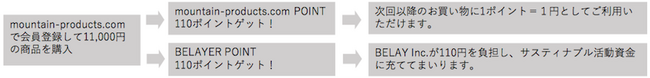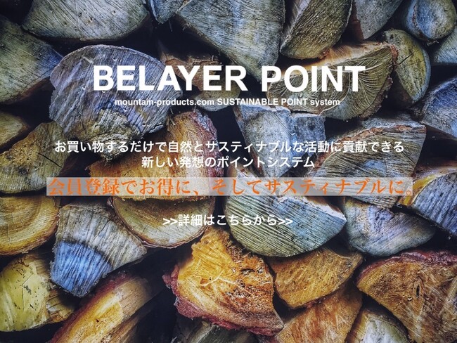 “mountain-products.com”では、会員登録(無料)してお買物すると、次回以降のお買物に使えるポイントが付与されると同時に、“BELAYER POINT”というポイントが付与されます。この“BELAYER POINT”とは、ポイント数(1ポイント=1円を弊社BELAY Inc.が負担、お客様への負担はありません)が、BELAY Inc.が行うサスティナブル活動に充てられます。