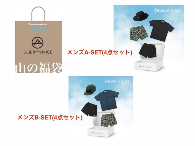 【BLUE infinity ICE 山の福袋2023】メンズA-SET(4点セット)と【BLUE infinity ICE 山の福袋2023】メンズB-SET(4点セット) の2種類を用意。水陸両用、アウトドアから街でも使用できるアパレルセット。
