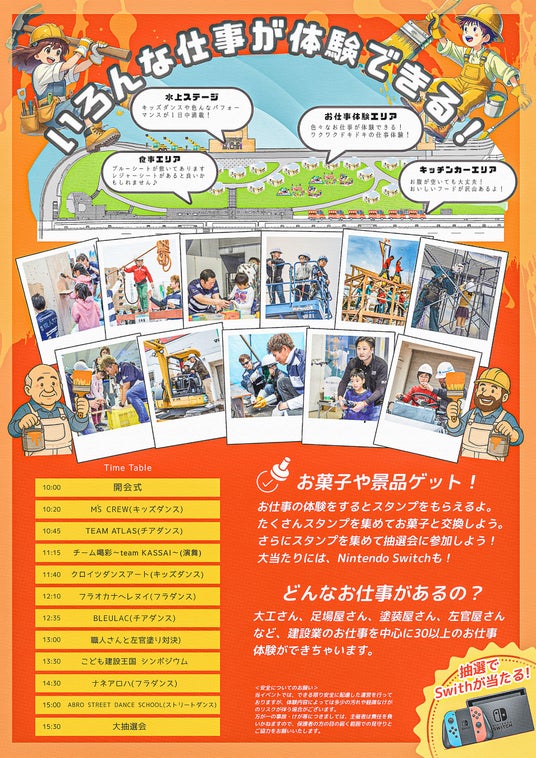 建設業を中心とした30以上の職業体験ブースで、こどもたちに仕事の楽しさや仕事は人の役に立つ事だと伝えるイベント。