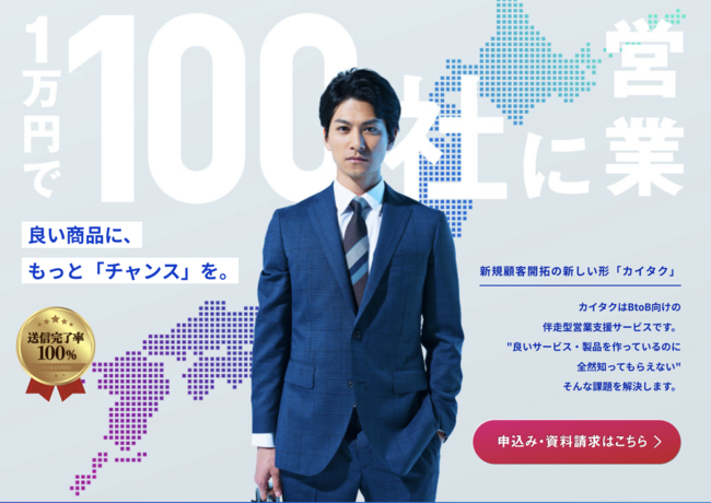 カイタクはBtoB向けの伴走型営業支援サービスです。”良いサービス・製品を作っているのに全然知ってもらえない”。そんな課題に対して、継続的な仮説検証を通じた勝ちパターン探しをしながら、新規顧客開拓の新しい形を提供するサービスです。
