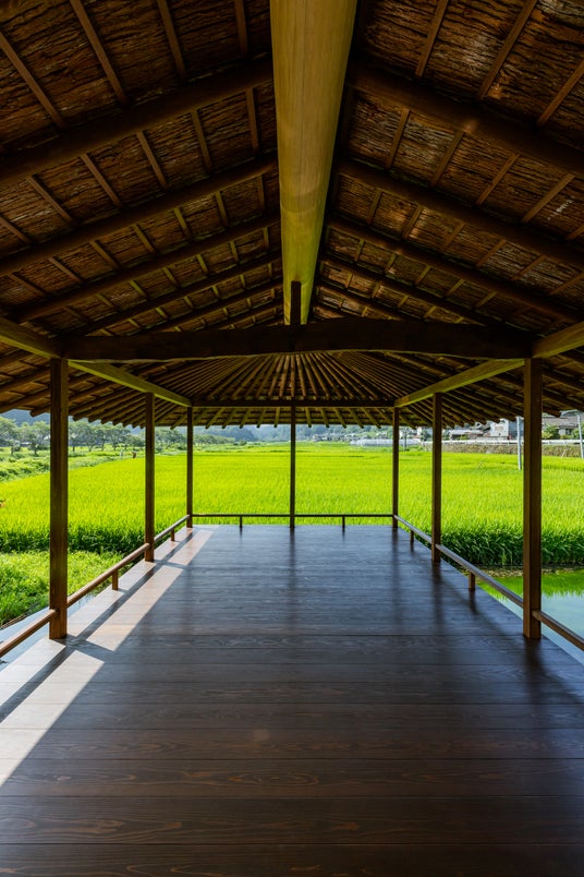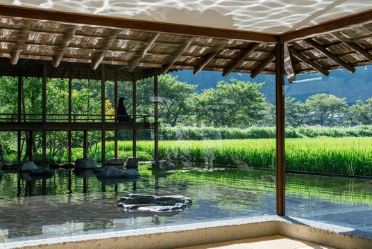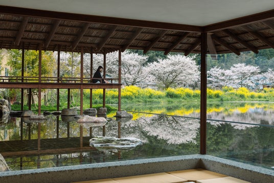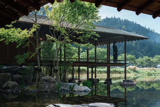 喫茶竹の熊では、建築に小国杉をふんだんに用い、天井には杉皮、屋根にはこけら葺きを施し、扇垂木が印象的な空間を構成しています。また、建物と水、そして木々が呼応しあう「水庭」は、訪れる人々に静かな感動をもたらす場となっています。