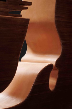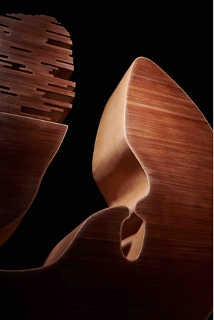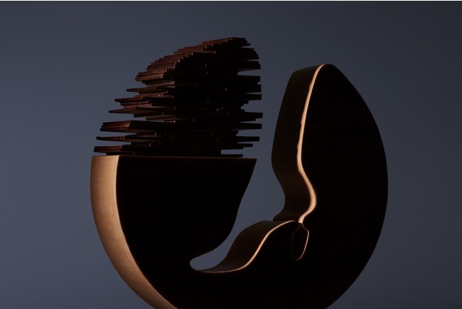 通常の靴作りのように、平面の革を足に沿うように這わせ、面を構成しながら形作るのでなく、足の周りの空間を造形してみせた。選んだ素材は、靴のヒールに用いる革。足の周りの空間を埋めるように、革が幾重にも積み上げられ、重厚感をもたらすレイヤーは、まさに、動物や昆虫が作り出す「巣」だ。すべてが手作業で為されたとは俄かには信じ難い、卓越した技術は本作でも余すところなく発揮されている。
