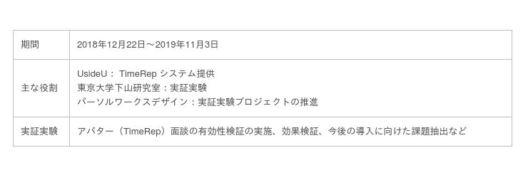 株式会社UsideU(ユーサイドユー)(本社:東京都中央区、代表取締役社長:高岡淳二、以下UsideU)は、東京大学大学院教育学研究科(研究科長:秋田喜代美、東京都文京区、以下東京大学)および総合人材サービスのパーソルグループで、BPO、ヘルプデスク/コールセンターのアウトソーシングなどを手がけるパーソルワークスデザイン株式会社(代表取締役社長:平林 由義、本社:東京都豊島区、以下パーソルワークスデザイン)と共同で TimeRep(タイムレップ、以下TimeRep)を活用したアバター心理相談サービスの開発を開始します。