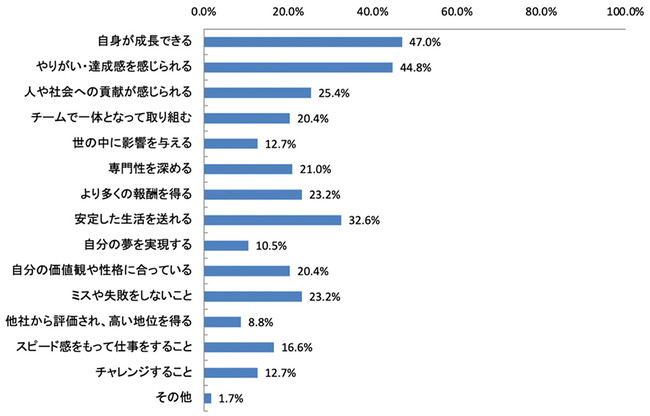 一方で、「安定した生活を送れる」が3位に入ったほか、「他者から評価され、高い地位を得る」「自分の夢を実現する」「世の中に影響を与える」「チャレンジをする」という回答は少なく、「着実に仕事をこなしたい」姿勢も垣間見えました。