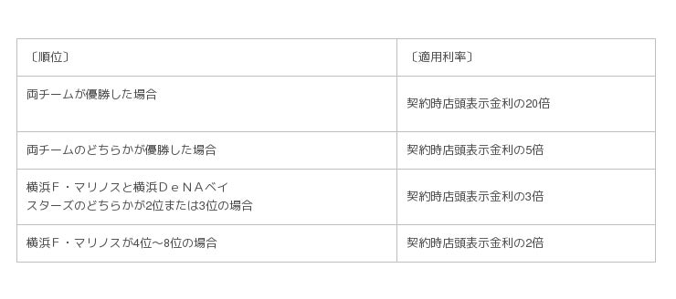 【条件】2019年明治安田生命J1リーグ戦およびセントラル・リーグ公式戦で最終的に確定した、横浜F・マリノスと横浜DeNAベイスターズの順位に応じて下記のとおり上乗せ金利を適用します。