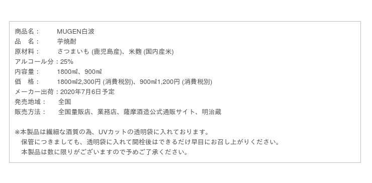 薩摩酒造株式会社 (代表取締役社長:本坊愛一郎、本社:鹿児島県枕崎市) は、昨年、主力ブランド『さつま白波[※1]』から数量限定のプレミアム焼酎として発売した『MUGEN白波』がご好評頂いた事を受け、今年も、7月6日(月)より数量限定で全国の量販店、業務店と薩摩酒造公式サイトで発売します。