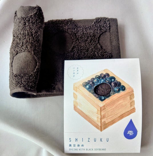 黒豆の規格外品を天然染料として利用し、特殊な染色方法を行っています。濃い色にもかかわらず高い吸水性と柔らかさを兼ね備えたタオルを目指し、国内で紡績した上質な糸を選別、織りにもこだわり、製造工程では、可能な限り化学薬品を削減し、環境にも配慮した商品に仕上げています。