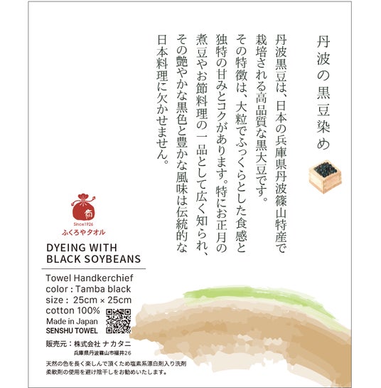 黒大豆生産者:丹波篠山にじいろ農園、タオル生産者:袋谷タオル合資会社、黒豆加工品製造業・販売元:株式会社ナカタニ