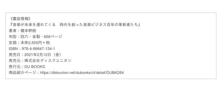 株式会社ディスクユニオン(千代田区/代表取締役:広畑雅彦)の出版部DU BOOKSは、2021年2月12日(金)に発売した『音楽が未来を連れてくる 時代を創った音楽ビジネス百年の革新者たち』(榎本幹朗著)を重版いたしました。