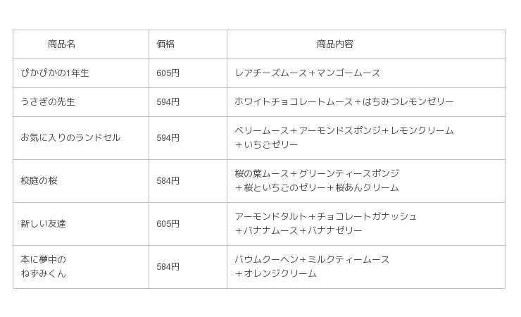 今回のマイスターケーキのテーマは「新しい春」。ぽかぽかと暖かい春の日差しに包まれた動物たちが、新しい出会いを祝福しているようです。ホワイトチョコムースにはちみつレモンを合わせた甘酸っぱいケーキや、定番のレアチーズケーキにフルーティーなマンゴーを組み合わせたケーキ。そして、春にぴったりの桜のモンブランが登場です。