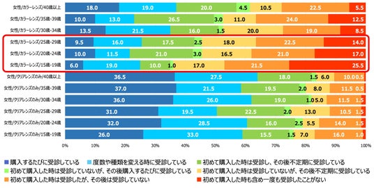 10代では、赤色で示している「初めて購入した時も含め一度も受診したことがない」が4人に1人(25.5%)おり、オレンジ色で示している「初めて購入した時は受診したが、その後は受診していない」の21.5%とあわせると、約半数(47%)が初めて購入した際、あるいはその後に、眼科受診をしていないことが明らかになりました。