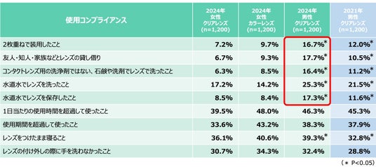 使用コンプライアンスについて聞いたところ、赤で囲んだ「2枚重ねで装用」、「レンズの貸し借り」、「専用洗浄剤ではない洗剤でレンズを洗った」、「水道水でレンズを洗った」、「水道水でレンズを保存した」の5項目で、男性ユーザーのほうが女性ユーザーよりも高い結果となり、2021年と比較しても大きく上昇していることがわかりました(図3)。以上のことから、使用コンプライアンスの低下と眼障害の発症には関連があると推測されます。