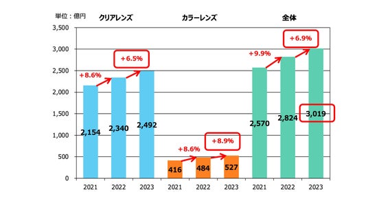 CL市場は、クリア・カラーともに拡大傾向にあります。2023年については、クリアCLで+6.5%、カラーCLで+8.9%、全体で+6.9%となり、 過去最高の3,000億円超えとなりました。