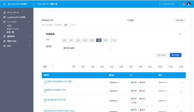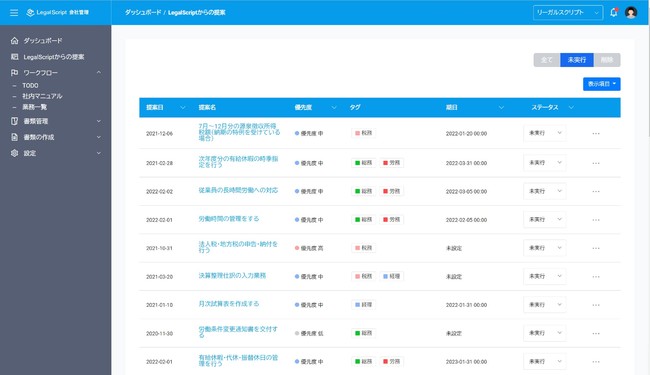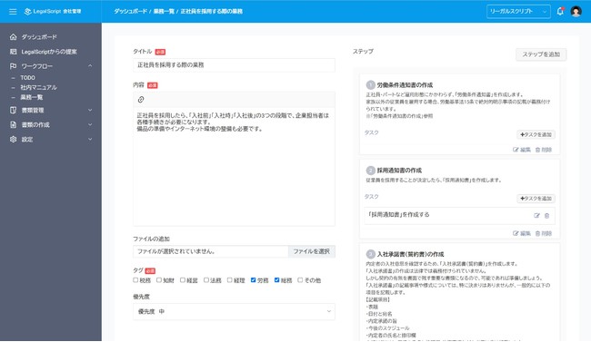 ユーザーはあらかじめ登録した企業情報に基づき、リーガルスクリプトから適時のタイミングで必要となる業務・ワークフローテンプレートの提案を受けることができます。このリストから実行の要否を選択していただき、業務をTODO化したり、ワークフローテンプレートを編集して社内マニュアル化することが可能です。また、これらの業務はフリーワードや業務カテゴリー等で検索することも可能です。