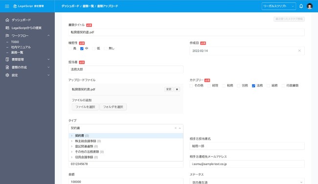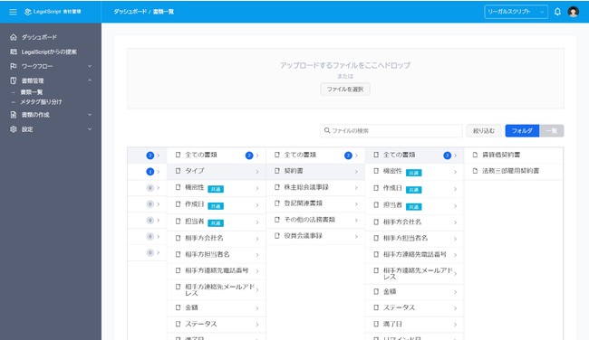 ユーザーは業務の遂行過程で発生する申請書、契約書等のドキュメントをアップロード・管理することができます。リーガルスクリプト会社管理ではメタデータ駆動型検索システムを採用しているため、アップロード時に付与されたドキュメントのメタ情報により、数クリックで候補となるドキュメント一覧にたどり着くことができます。これにより従来のフォルダベースのドキュメント検索に比べて圧倒的な検索効率を実現することが可能になりました。また、各メタデータは書類のタイプ(種類)事に最適化されており、適切な書類管理が可能です。
