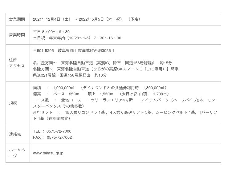 中部スノーアライアンス株式会社 (本社:〒501-5305 岐阜県郡上市高鷲町西洞3086-1/代表取締役 多賀真瑞)は、岐阜県奥美濃にある西日本最大級のスキー場「高鷲スノーパーク」の営業開始日を2021年12月4日(土)に決定いたしました。初日よりSPゴンドラとダイヤモンドクワッドリフト( 4人乗り高速リフト)を運行し、山頂よりダイヤモンドコース(2,500m)の滑走が可能となります。