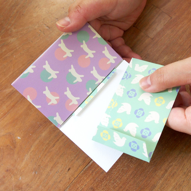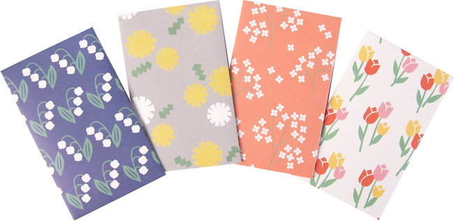 ▲1枚1枚違う柄なのも嬉しい。1冊につき4柄入り!(写真上:b360 ハッピーフラワー、下:b358 水彩文様)