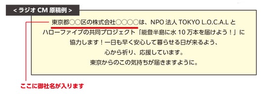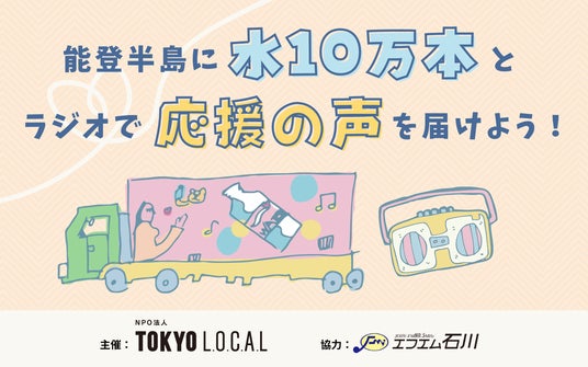 そのような状況を受けてNPO法人TOKYO L.O.C.A.L(トーキョーローカル)は、地元ラジオ局・エフエム石川の協力を得て、被災された方々へ「応援の声」を届ける「支援物資付き復興支援ラジオCM」プロジェクト「被災地に水10万本とラジオで応援の声を届けよう!!」を立ち上げました。
