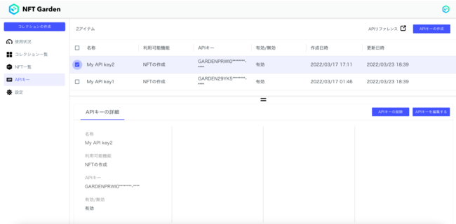 開発者用APIの標準提供に伴い、NFT GardenのAPIリファレンスマニュアルをNFT Gardenのサイト上で公開いたしました。ドキュメントを参照しながら開発を進めて頂くことで、従来のプログラミング言語を使用しAPIと連携した開発が可能となります。これを機会に、より多くの開発者にNFTを活用した開発を行なって頂きたいと考えております。