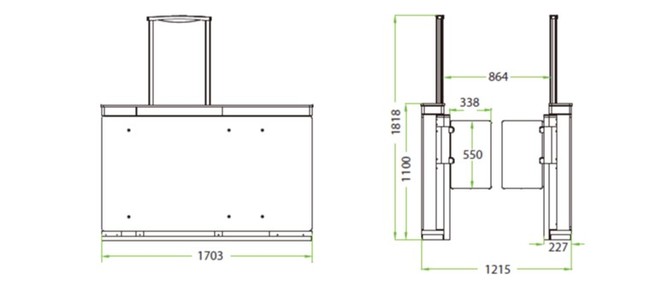 大きさ:1703(長さ) x 1215(幅) x 1818(高さ)mm(以下の図参照)