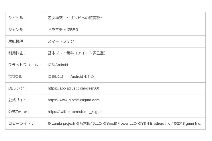 株式会社gumi(本社:東京都新宿区、代表取締役社長:川本 寛之)は、「ザンビ」プロジェクト第3弾で、ドラマ「ザンビ」出演の乃木坂46メンバーが登場するスマートフォン向けアプリゲーム『乙女神楽~ザンビへの鎮魂歌~』について、累計100万ダウンロード(本ダウンロード数には特定のユーザが複数回ダウンロードを行った数値も含まれています)を突破したことをお知らせ致します。