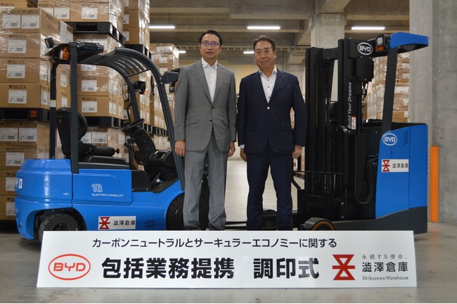 本提携に基づく取り組みの第一弾として、澁澤倉庫グループはBYD製の電動フォークリフトとEV商用バンを導入し、両社はこれらの車両に搭載されたバッテリーの循環利用に向けた枠組み構築を進めてまいります。