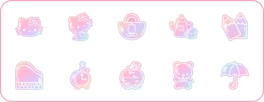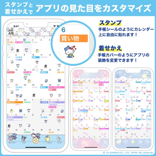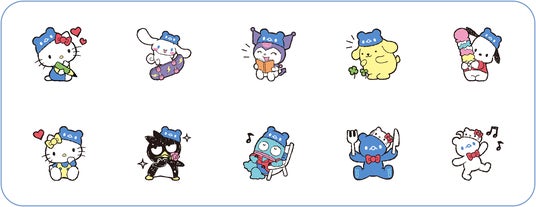 第1弾はハローキティ50周年記念デザイン。その後もシナモロール、ポムポムプリン、クロミ、マイメロディ、キャラクターユニットのはぴだんぶいなど様々なキャラクターの着せかえ、スタンプをリリースします。