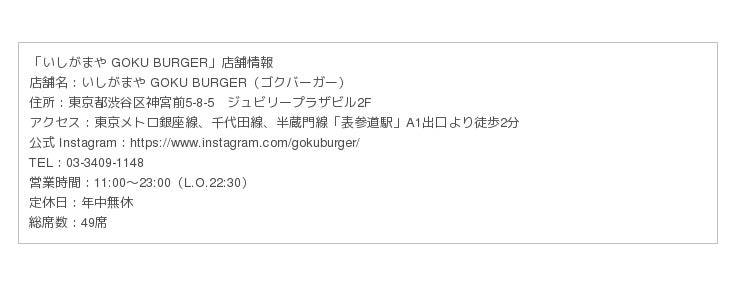2008年に吉祥寺でのオープンを皮切りに、商業施設内を中心に国内18店舗、インドネシア1店舗、計19店舗(2019年7月現在)展開しているハンバーグ専門店「いしがまやハンバーグ」の 2年間限定の初のグローバル旗艦店。赤みが多くヘルシーなオーストラリア産黒毛牛のナチュラルビーフ100%(アンガス種)を使用し、独自に開発したハンバーグ専用石窯で焼き上げたハンバーグを、「いしがまや GOKU BURGER」限定でそのままハンバーガーとして提供。 GOKU GLOVE(ブラック手袋)をつけてソースにディップして食べていただくというハンバーグの新しい食べ方を提案しています。