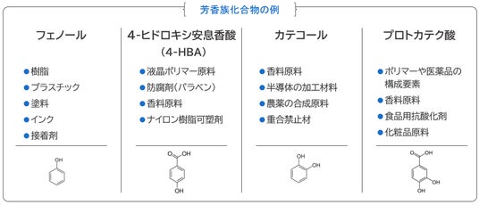 株式会社CO2資源化研究所(本社 東京都港区 代表取締役 湯川英明)は、二酸化炭素(CO2)を原料とする芳香族化合物(フェノール・4-ヒドロキシ安息香酸(4-HBA)・カテコール・プロトカテク酸など)の生成技術を開発しました。本技術は特許を出願済みであり、今後の実用化に向けた検討を進めています。