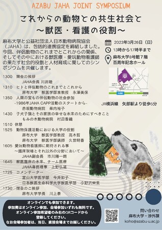 また、今回、伴侶動物のこれまでとこれからの関係、そしてその中における獣医療・愛玩動物看護師の果たす社会的役割と人材育成に関してのシンポジウムを共催します。奮ってご参加ください。